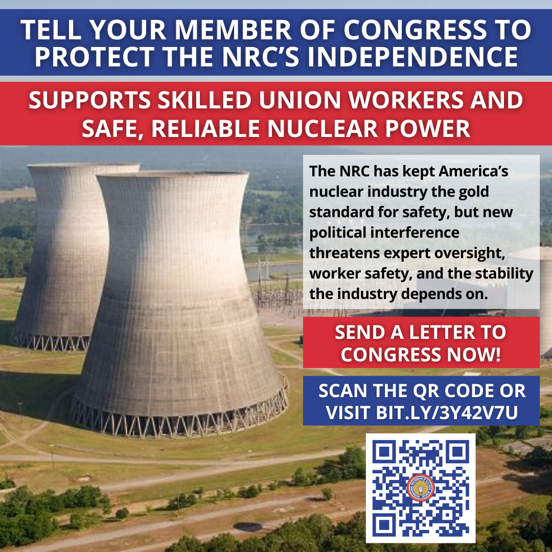 - I’m a proud IBEW member who supports the independence of the Nuclear Regulatory Commission. The NRC has kept America’s nuclear industry the gold standard for safety, but political interference is now threatening the expert oversight, worker safety, and stability the industry depends on. Stand with the IBEW and defend a strong, independent NRC by writing to your members of Congress today. https://bit.ly/3Y42v7U” [Insert SM graphic 1, graphic 2, or graphic 3]